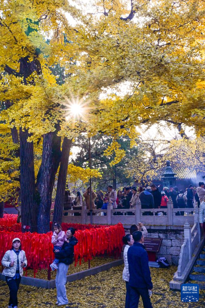 11月8日,人们在北京红螺寺赏景。初冬时节,北京怀柔的红螺寺、雁栖湖等地森林茂密,景色绚丽多彩,吸引了众多游客前来赏景。新华社记者 陈业华 摄