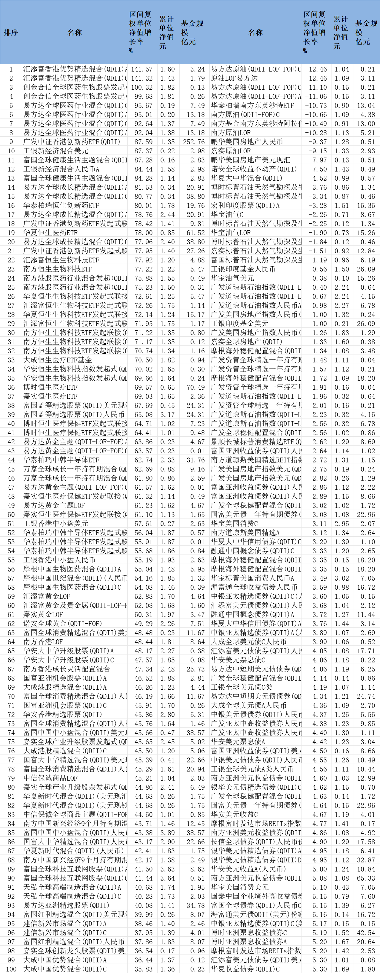 中国经济网北京12月8日电(记者何晓)今年前11个月,市场上业绩可比的650只QDII基金(各类股票单独计算,下同)中,共有626只基金净值上涨,占比96.3%; 24只基金净值减少。年初以来,精选创新医药板块,相关个股普遍上涨,重仓该类股票的基金也取得了不错的回报。同花顺数据显示,汇添富香港优势精选混合A/C LED QDII基金首11个月收益率分别为141.57%和141.32%。三季报显示,汇添富香港优势精选混合空调沿着以下方向进行投资和布局主线:1)创新医药:产品具有全球竞争力和增长空间的制药和生物技术; 2)顶级装备d 进口替代率低、壁垒高的消费品。三季度末,汇添富香港优势精选混合A/C前十大持股分别为银正生物、科伦坡泰生、信达生物、三生制药、康诺雅、石药集团、恒瑞制药、诺诚健华、荣昌生物、复宏汉霖。该基金现任基金经理为张伟。张伟曾任东方证券医药助理研究员、汇添富基金医药研究员、高级医药研究员、医药行业研究团队负责人。同时,9只QDII基金11月上旬涨幅超过87%,其中4只为易方达基金管理有限公司E和Fund ng全球医药产业组合(QDII)C(美元现货份额)、易方达全球医药产业组合(QDII)A(美元现货份额)、易方达全球医药产业组合(QDIi)C(人民币份额)、易方达全球医药产业组合(人民币份额)的产品易方达医药行业组合(QDIi)C(人民币股)、易方达全球医药行业组合(QDIi)C(人民币股)、易方达全球医药行业组合(QDIi)C(人民币股)、易方达全球医药行业组合(QDIi)C(人民币股)、医药行业(QDII)A(人民币股)均上涨超过92%。三季度末,上述四只基金持股前十名分别为复宏汉霖、信达生物、科隆生物、银正生物、乐普生物、康诺雅、中国生物制药、豪森药业、三生制药、荣昌生物。这四只基金目前由基金经理杨振晓管理,杨振晓现任易方达基金管理有限公司基金经理。有时11月1日涨幅超过87%的nagshe ilbi投资经理、行业经理和基金中的基金分别是创金和信全球医药生物股票计划(QDII)和信全球医药生物股票计划(QDII)C、广发中国S证券香港创新药ETF(QDII)、工银新经济混合美元、富国全球健康生活主题混合美元现货,涨幅分别为100.32%和99.68%。 、87.59%、87.37%、87.28%。以工银新经济混元为例,三季度末,基金持仓前十大分别为信达生物、金方药业、科伦坡泰生、新诺威、三生制药、中国生物制药、热精生物、康方生物、荣昌生物、石药集团。目前由基金经理赵蓓管理。赵蓓于2010年加入工银瑞信,现任研究部副主任、医疗保健研究部主管。跌幅榜上,前11个月QDII基金主要为原油、油气、房地产产品。此外,一些跟踪富时沙特阿拉伯指数的QDII基金也没有变化。 2025年前11个月排名前100名的QDII基金数据来源:Flush(规模截止日期:2025 年 9 月 30 日)